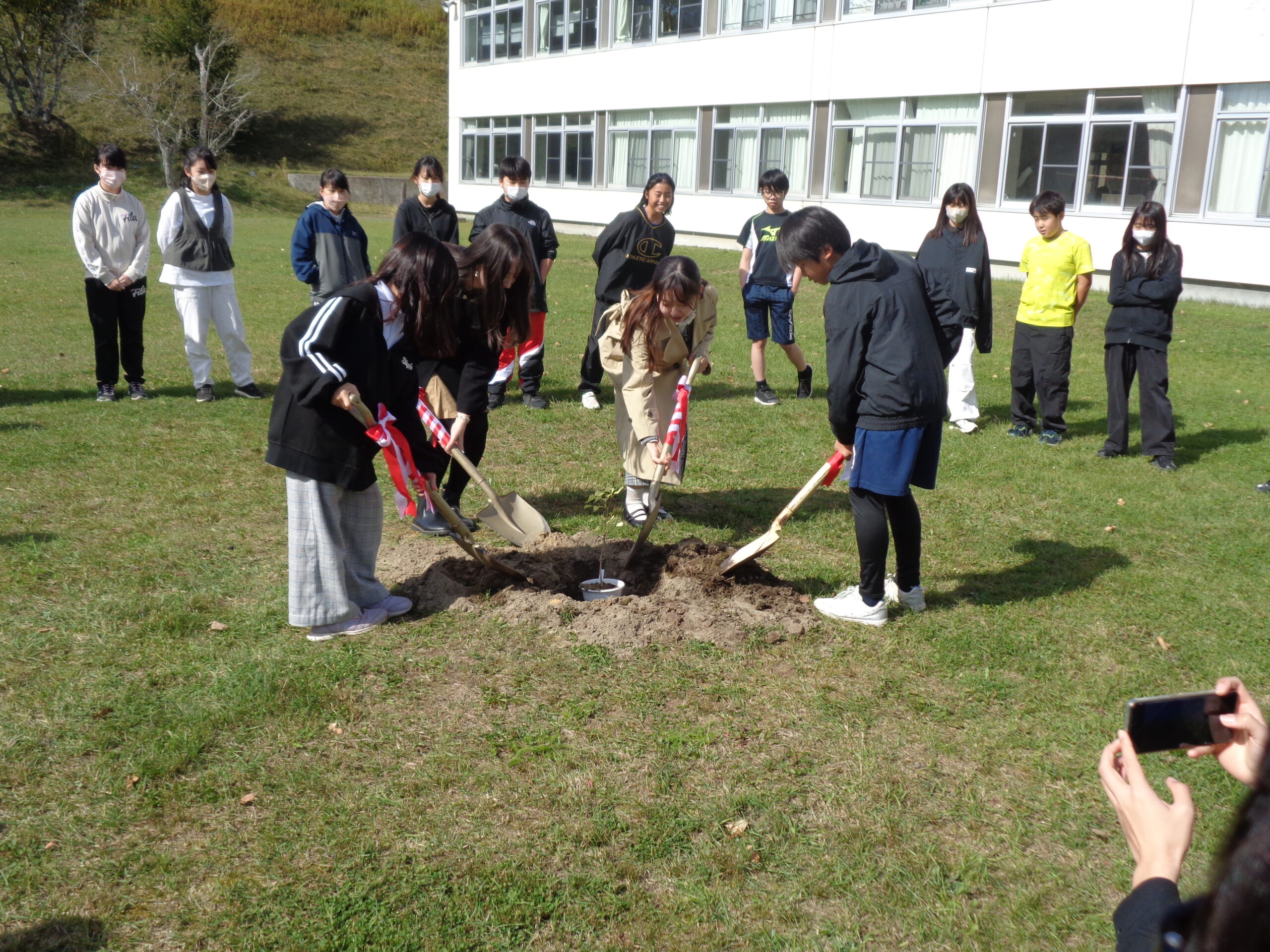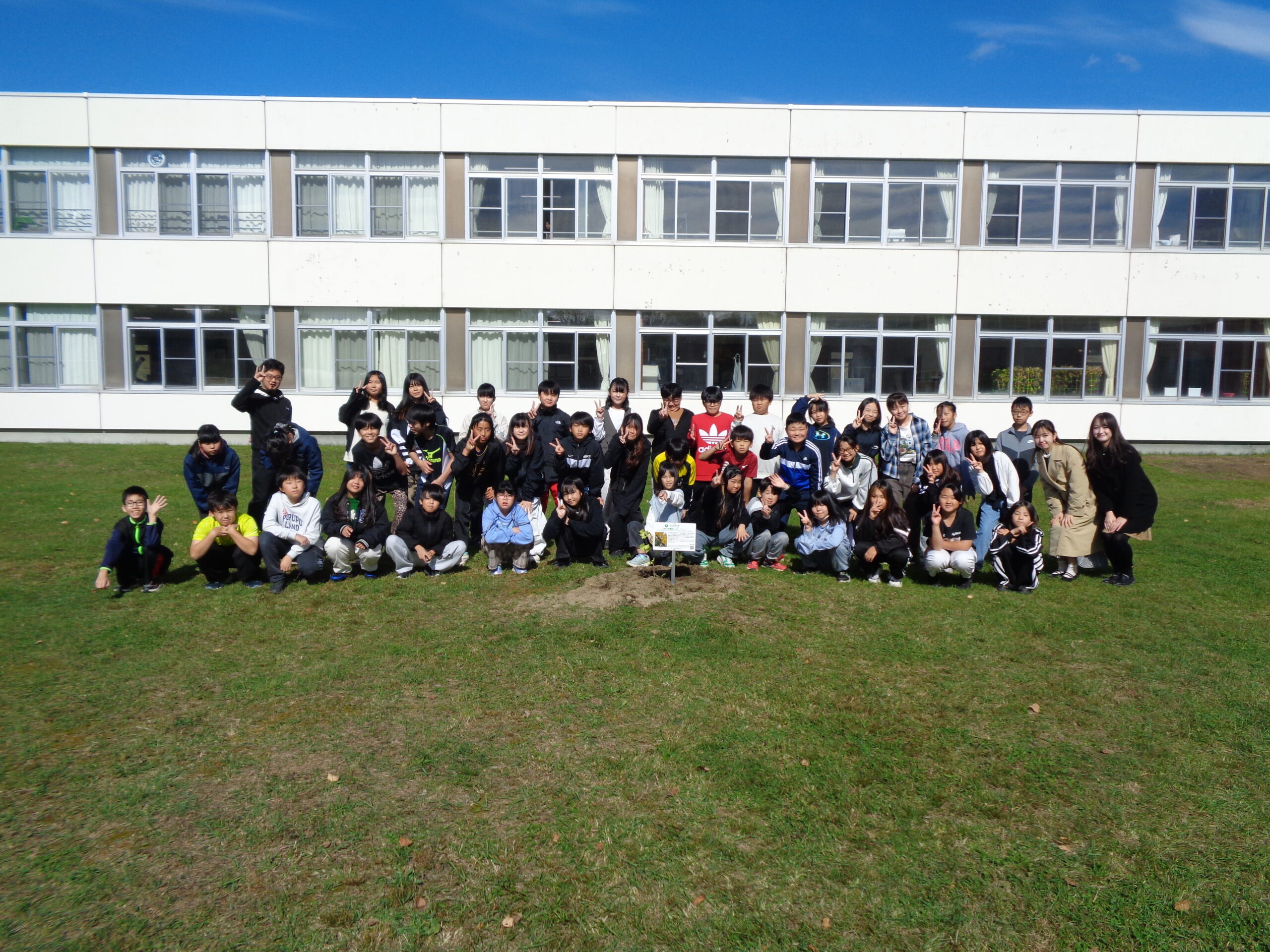 併せて、釧路町核廃絶宣言40周年の記念として、遠矢小学校の中庭に「イチョウ」の木を植樹しました。イチョウが育つまでには、まだまだ年月がかかりますが、平和のシンボルとして大きく育ってくれることを期待しています。