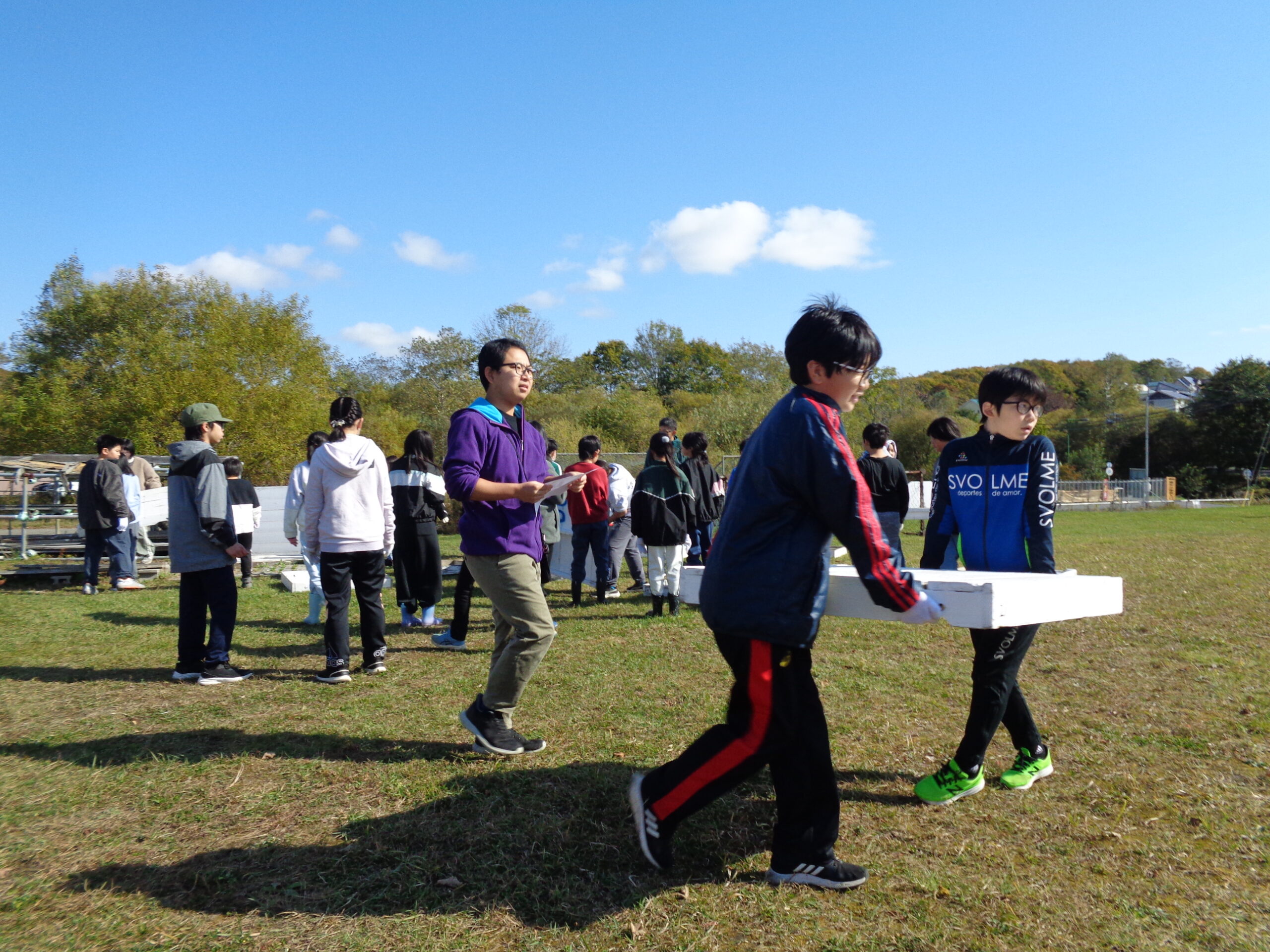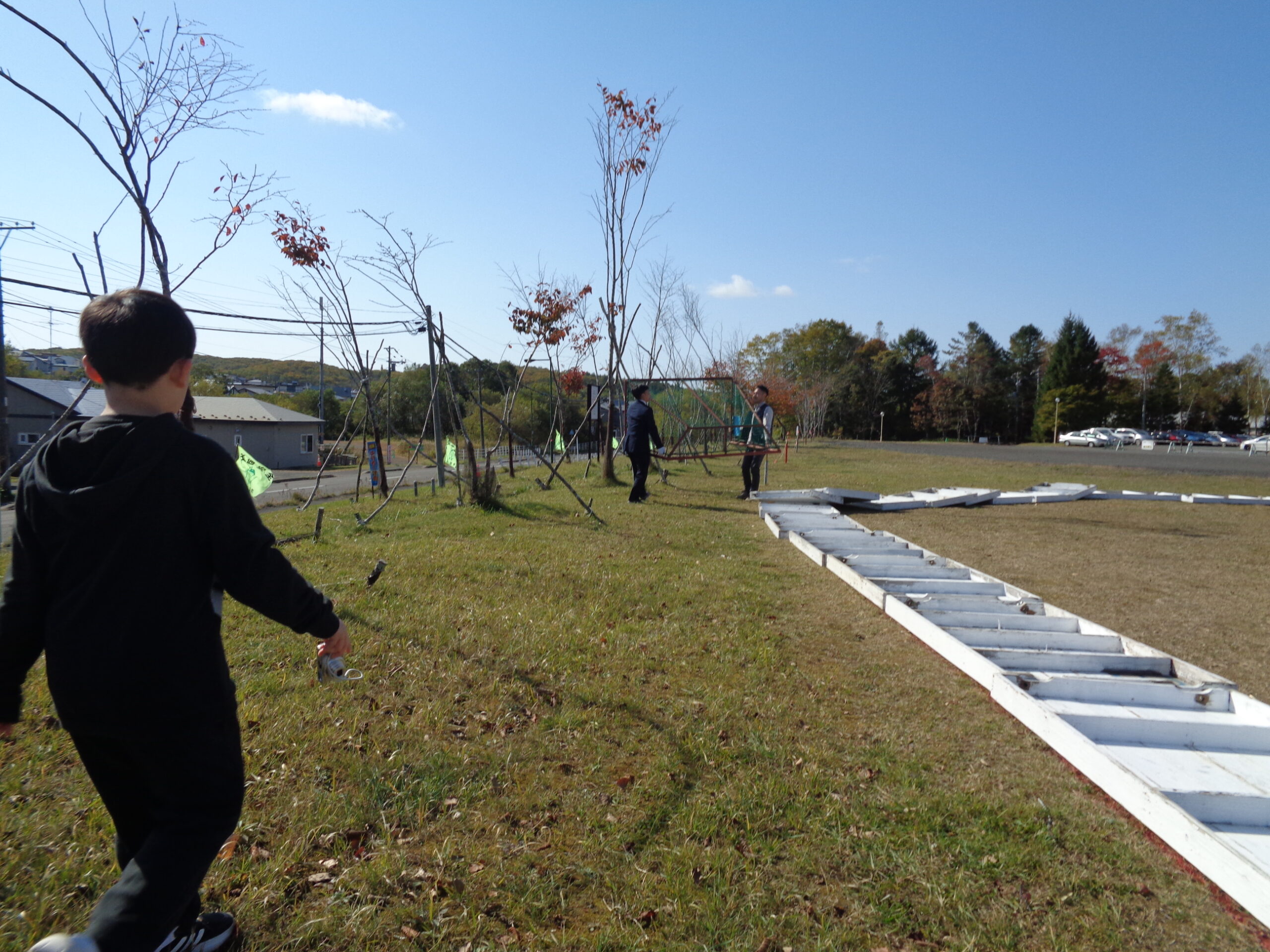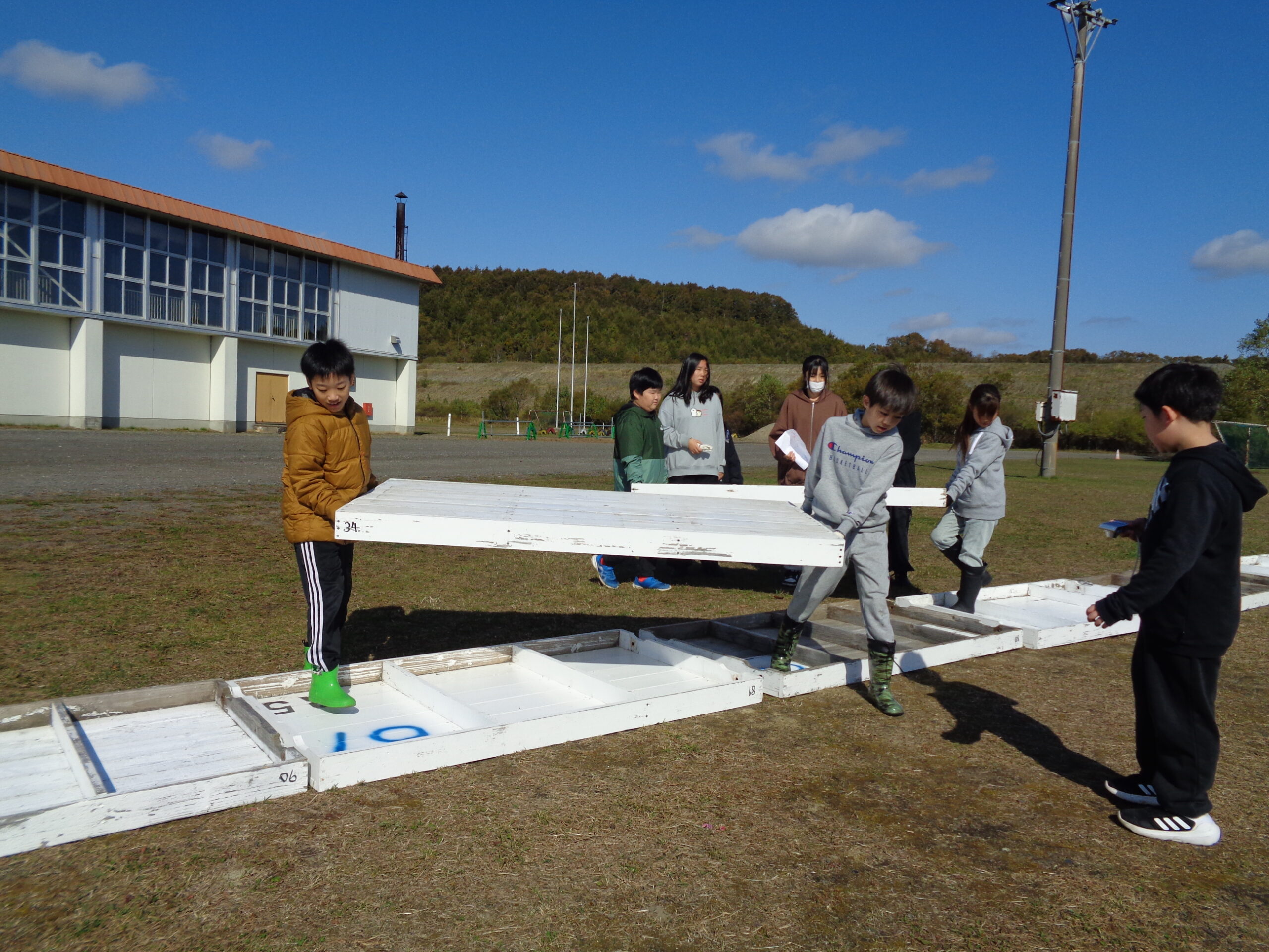 子どもたちは2~4人ほど組になりリンクの壁になる板を運び番号順に並べていきました。